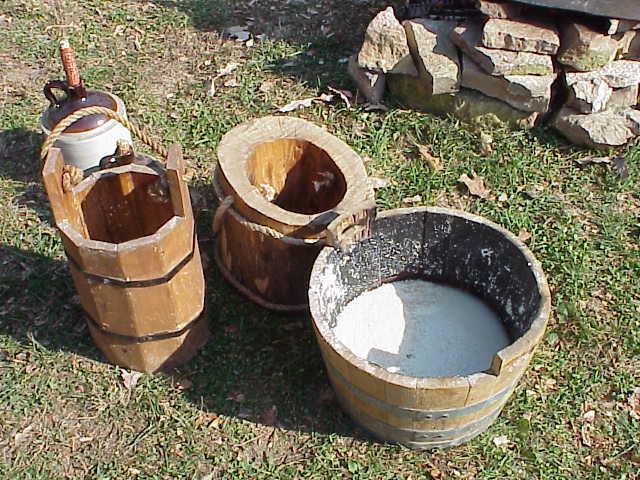 some wooden basins/containers, a fire place or pit, a great deal of cut wood,